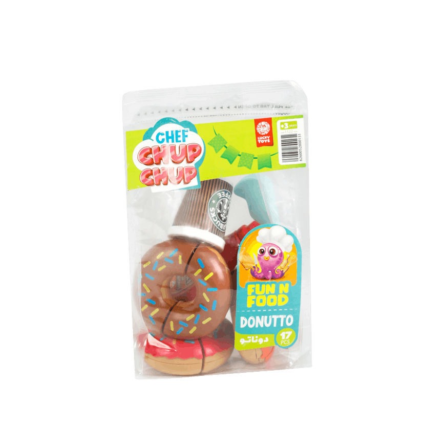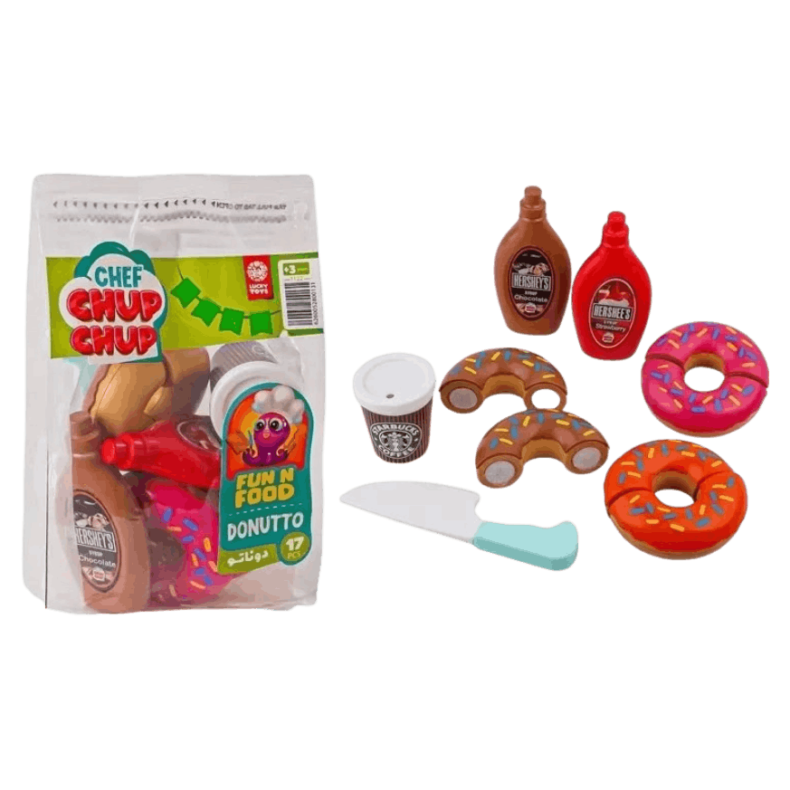 This toy is one of the products of Lucky Toy Company. All children who are interested in baking and baking will enjoy this toy. This product is a pack of donuts and is offered to you in nylon packaging. It includes a knife to cut the donuts, 3 donuts, a drink, two sauces in chocolate and strawberry flavors.
