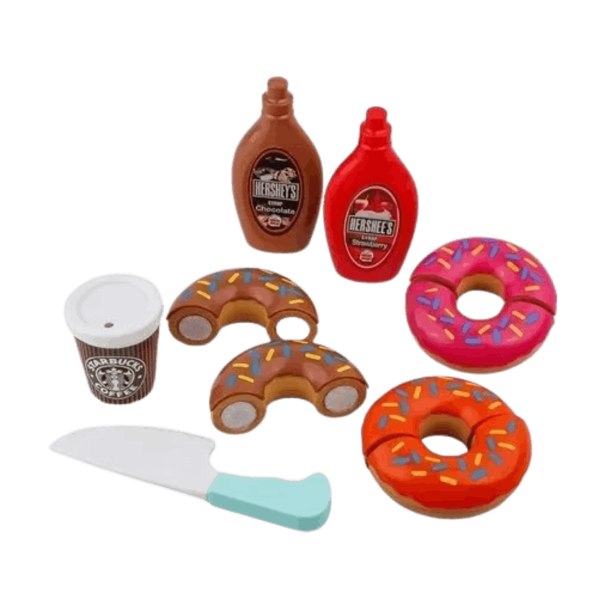 The child can connect the donuts together or divide them into 2 parts with a knife. There is a magnet installed at each end of the donuts and the child can connect them together again.