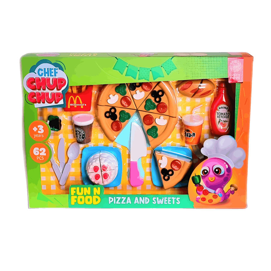 This product is a pizza and sweets pack. This toy is produced by Lucky Toy Company and is made of good plastic and without sharp edges for children over 3 years old. Happy colors are used in this toy and the child enjoys playing with this toy.