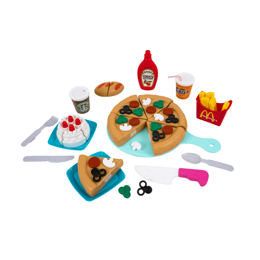 The packaging of this toy includes a whole pizza, a small cake, potatoes, ketchup, a cold drink and a hot drink, a knife, a spoon and a fork. The decorations on the cake and pizza are detachable and the child can move them as he wishes.