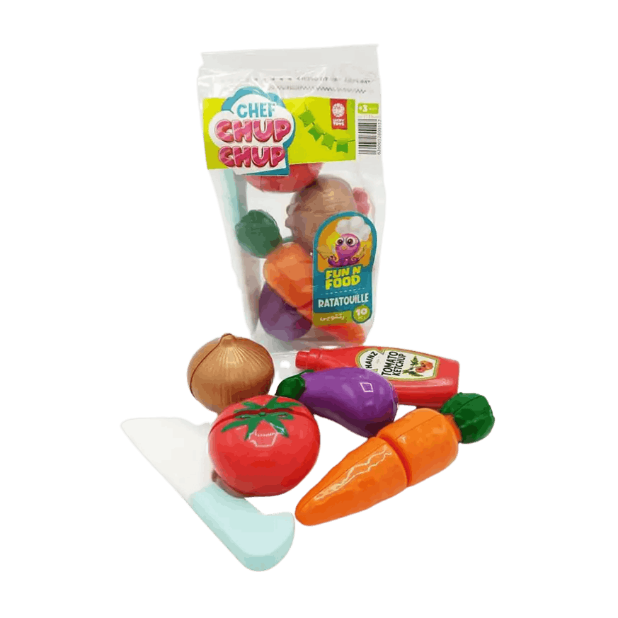 This product is one of the products of Lucky Toy Company called Rettoui. This product is in blister packaging and includes a carrot, an onion, an eggplant, a tomato and a ketchup sauce and a knife.