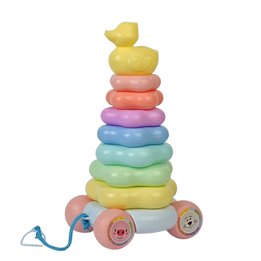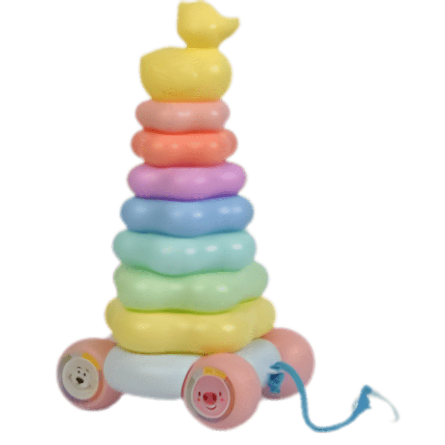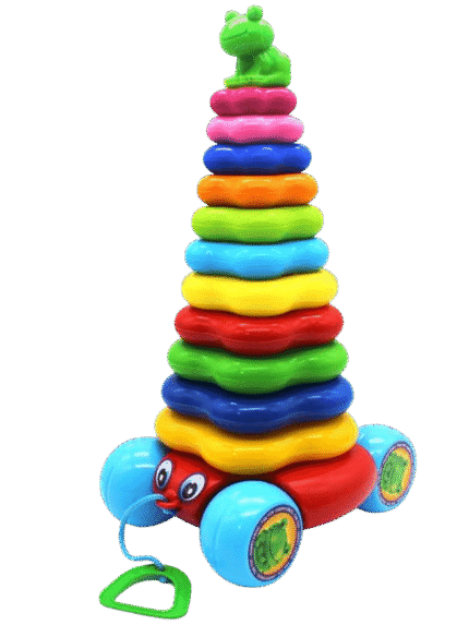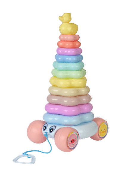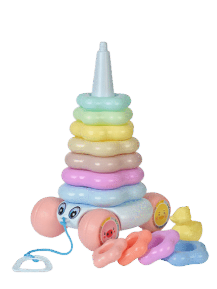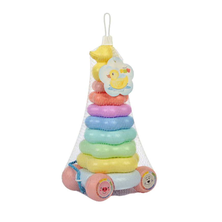 دو اسباببازی در یک: بچهها میتوانند حلقهها را روی هم بچینند تا مهارتهای حرکتی ظریف خود را توسعه دهند و اسباببازی را بکشند تا راه رفتن را تشویق کنند.