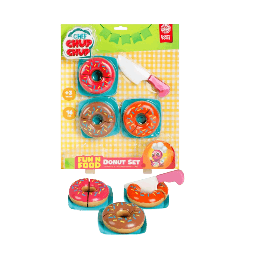 این اسباب بازی یکی از محصولات شرکت لاکی توی هست. تمام کودکانی که به شیرینی پزی و پزیرایی علاقه دارند از این اسباب بازی لذت خواهند برد. این محصول یک پک دونات است و در بسته بندی وکیوم به شما عرضه میگردد. شامل چاقو برای برش دونات ها ، 3 دونات و 3 عدد پیش دستی پلاستیکی است.