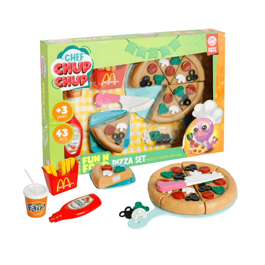 این محصول یک پک پیتزا است و کودکانی که عاشق این غذا هستند و یا دوست دارند که به عنوان آشپز بازی کنند و پیتزا بپزند بسیار مناسبه. رنگ های این اسباب بازی بسیار شاد و زیباست. کودک میتواند اجزای مختلف روی پیتزا را جدا کرده و جابجا کند.